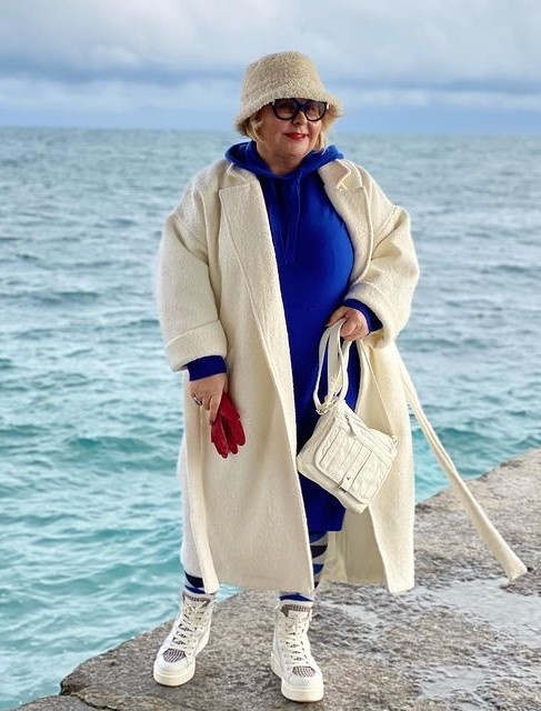 11. Темно-синее теплое платье с капюшоном будет хорошо выглядеть в ансамбле с пестрыми плотными колготками и тяжелыми белыми ботинками на шнуровке. Стильно дополнить такой образ для полной дамы способно длинное шерстяное пальто классического кроя без застежки. Распахнутые полы пальто – это вертикальная линия, делающая фигуру стройной, а его бледно-бежевый оттенок красиво оттеняет цвет платья.