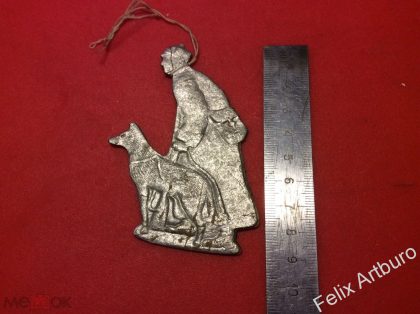 Непримечательная с виду картонная елочная игрушка имеет особую ценность благодаря историческому факту. На ней изображен Герой Советского Союза — бравый пограничник Никита Карацупа. Рядом с ним неизменный помощник — пес по имени Ингус. На самом деле собак у него было 5, и первую звали Индус. Но после содружества с Индией, Никита поменял кличку на созвучную.
