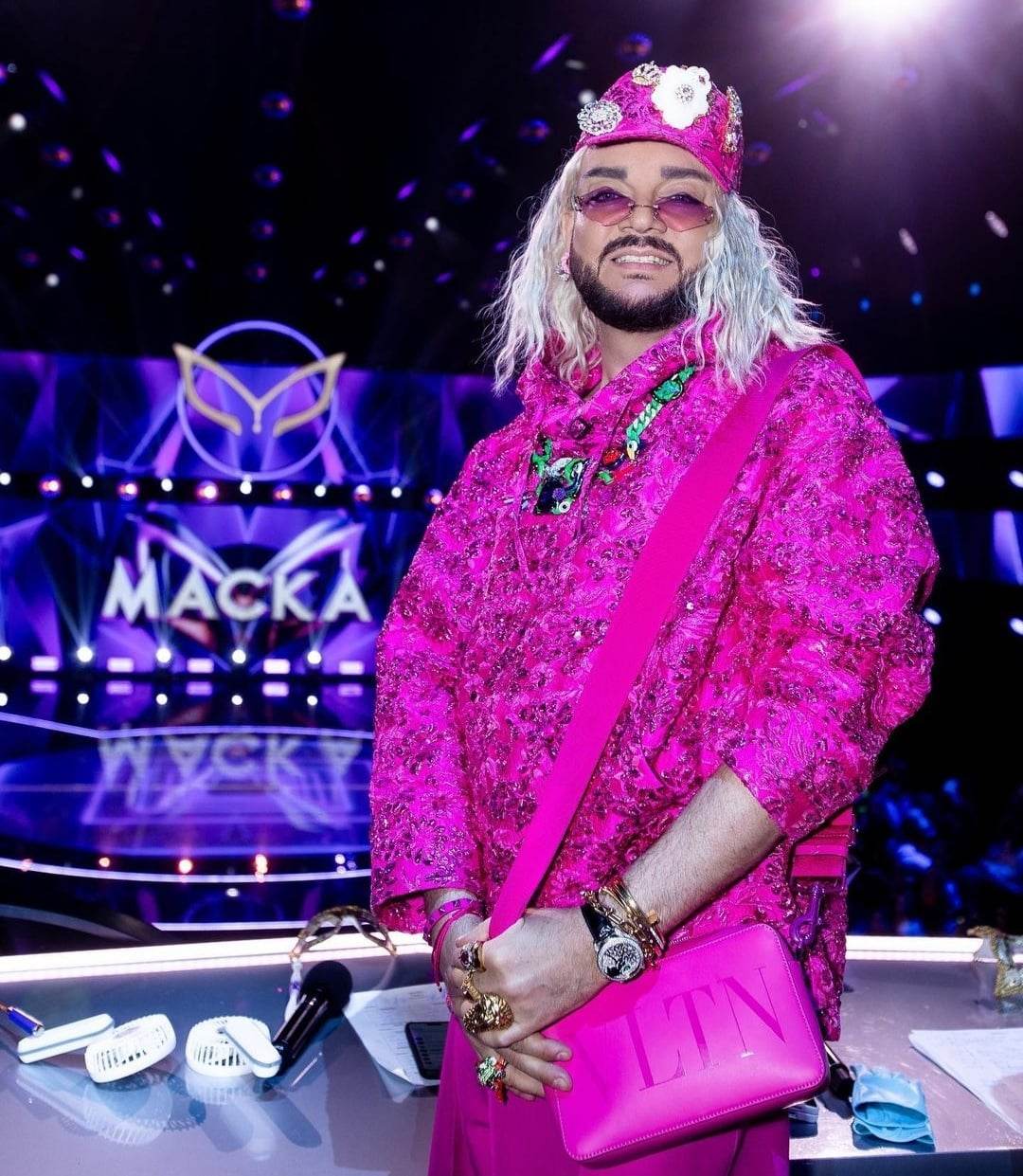 На сей раз помолодевший Филипп Бедросович предстал перед поклонниками в розовом наряде, дополнив образ женской сумочкой.