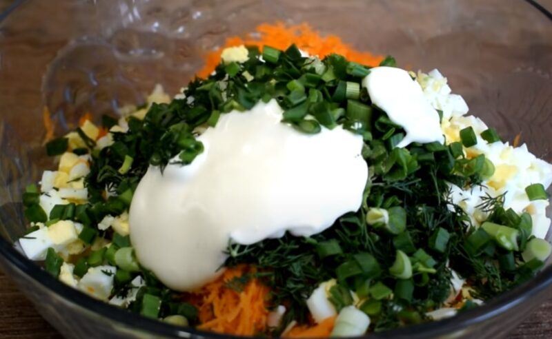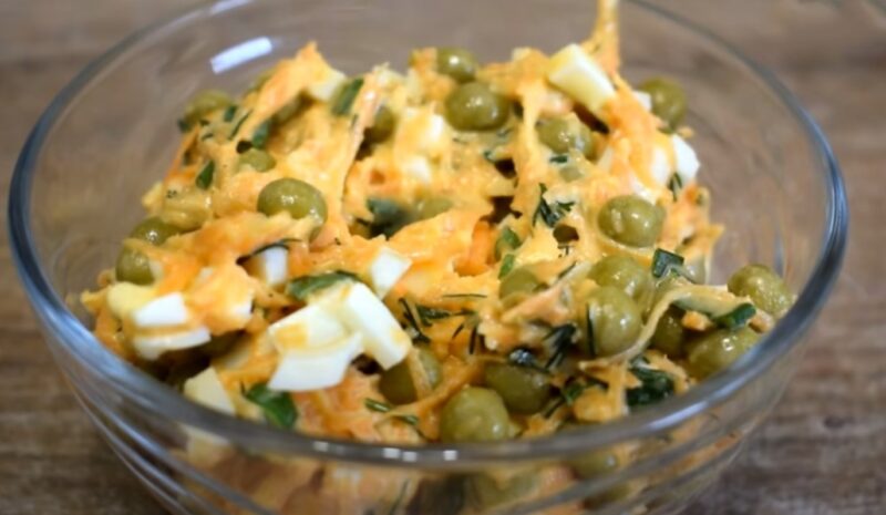 Натираем очищенную морковь на мелкой терке. Варим яйца вкрутую, очищаем и нарезаем маленьким кубиком. Выкладываем яйца и морковь в салатник к горошку.