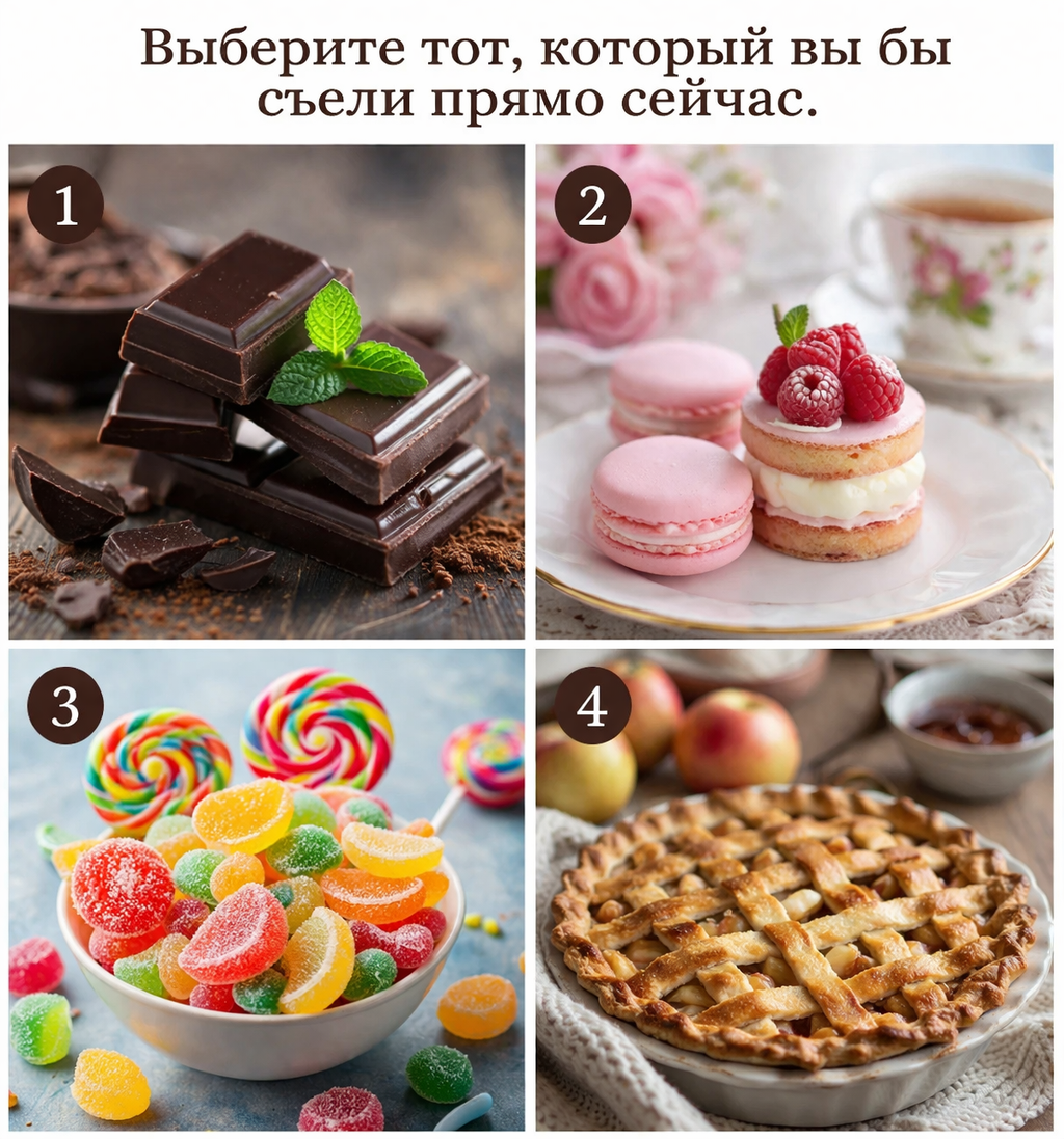 Мы выбираем десерты не только по вкусу, но и по настроению. Сахар дает нам быстрый дофамин, но форма, в которой мы его получаем, может рассказать о наших скрытых чертах характера. Посмотрите на эти четыре типа сладостей и выберите тот, который вы бы съели прямо сейчас.
