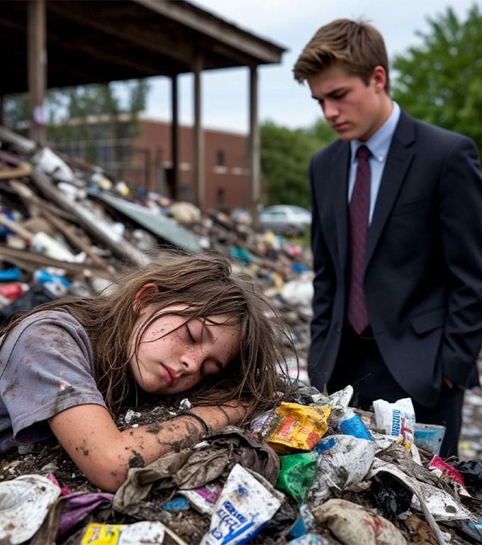 В тот вечер Игорь возвращался домой после долгих переговоров. Усталый и раздражённый, он шёл мимо узкого переулка, когда вдруг услышал едва слышный всхлип. Внимание привлекла чёрная мусорная яма, из которой доносилось что-то живое. Подойдя ближе, он увидел маленькую девочку, устроившуюся среди отбросов, будто это была её обычная кровать.