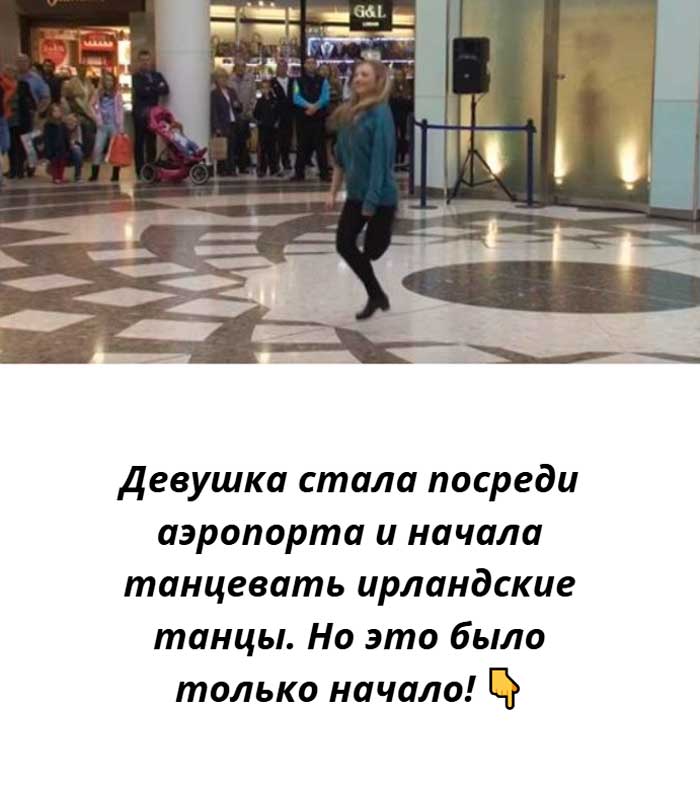 Секунды — и обычный зал аэропорта стал сценой для настоящего флешмоба. Синхронность движений, скорость, ритм и невероятная энергетика ирландского танца захватили внимание всех присутствующих. Это уже было не просто выступление, а полноценное шоу.