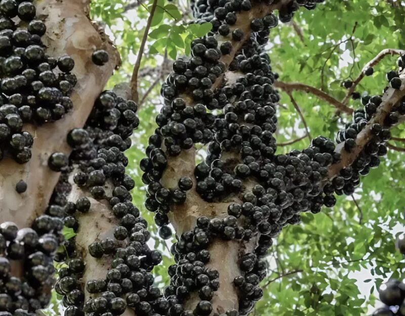 Перед вами одно из самых необычных деревьев в мире — жаботикаба (Plinia cauliflora). Родом оно из Бразилии и поражает воображение своим уникальным способом плодоношения: ягоды растут не на ветках, а прямо на стволе и толстых сучьях.