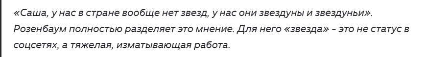Розенбаум недоволен молодыми артистами. Они участвуют в нескольких шоу на федеральных каналах, а потом считают себя «звёздами». Но артист должен служить публике. В стране не осталось талантливых личностей. Многие покинули РФ. Розенбауму грустно наблюдать за происходящим. Розенбаум процитировал своего коллегу Вахтанга Кикабидзе.
