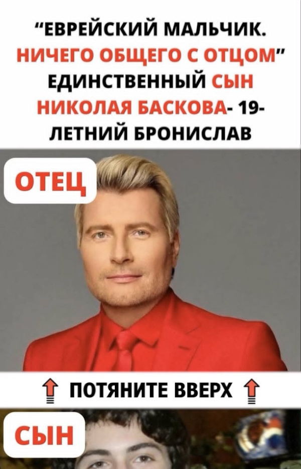 “Еврейский мальчик. Ничего общего с отцом” ,- так в Сети описали единственного сына Николая Баскова- 19-летнего Бронислава. Журналисты подловили единственного наследника артиста на улице и попытались задать ему пару вопросов. Бронислав и слушать не хочет о своем родителе. “У меня свой путь, и в нем нет места этому человеку”,- заявил молодой человек.