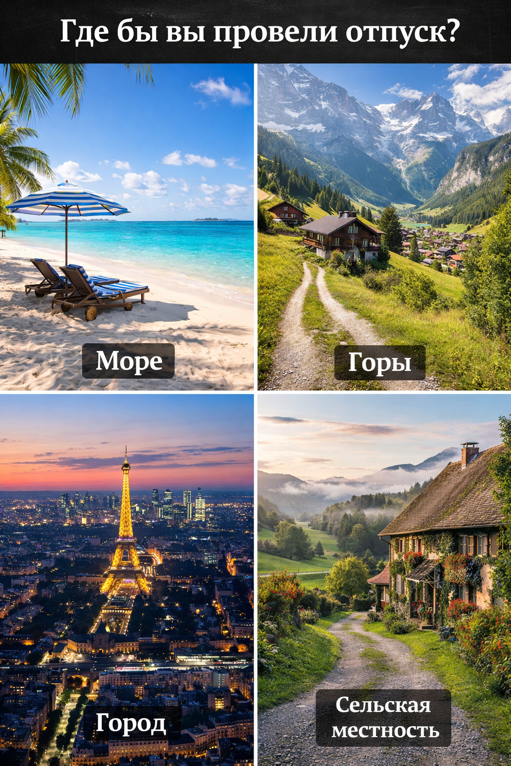 Выбор места для отдыха — это не просто поиск красивых видов. Это подсознательный сигнал о том, чего вашему организму и психике не хватает прямо сейчас. Посмотрите на эти четыре направления и выберите то, куда вам хочется отправиться немедленно.