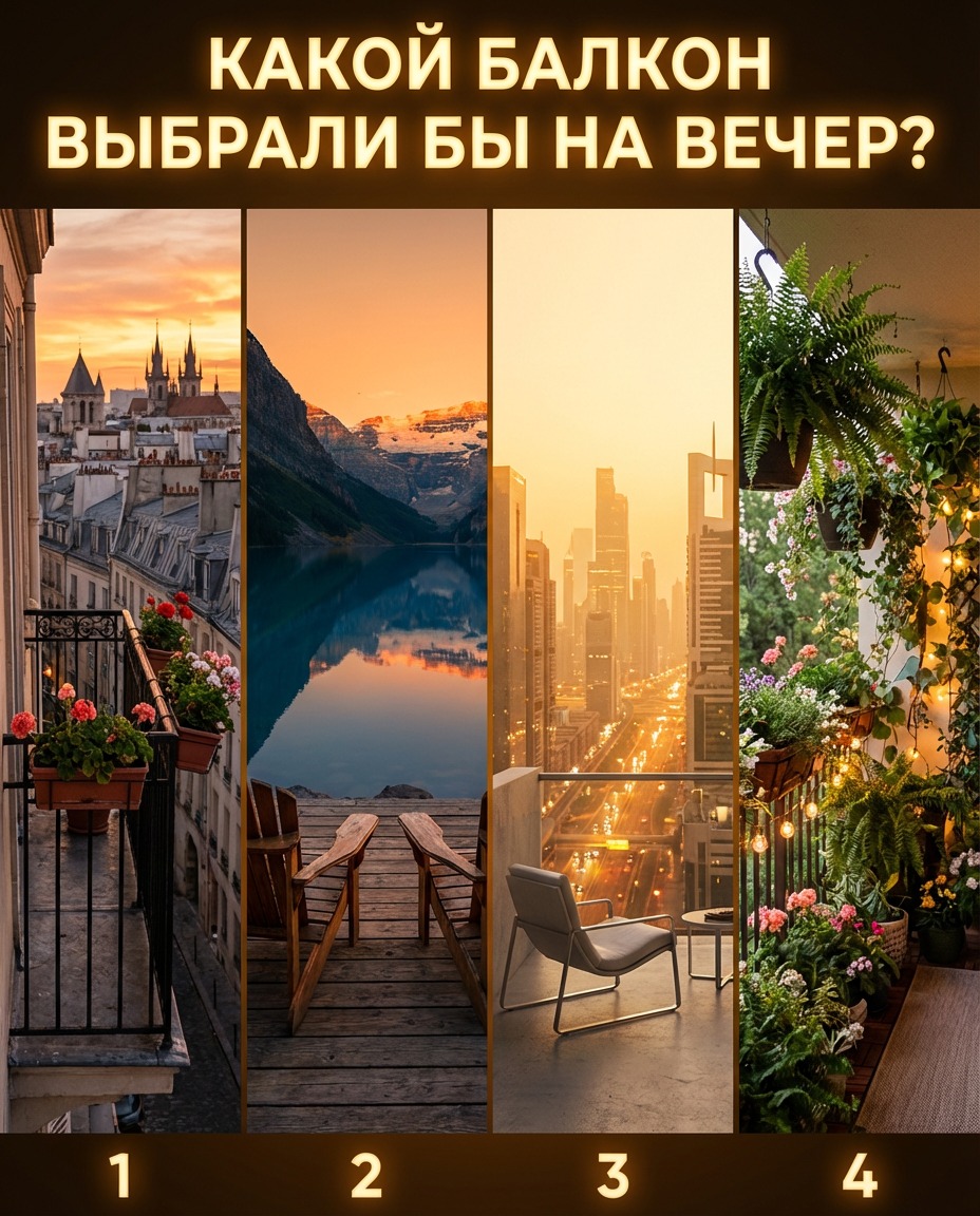 Третий балкон — это гимн современному мегаполису. Высотка, стекло, сталь, скоростные трассы, превращающиеся в световые реки внизу, и бесконечные окна небоскребов, отражающие последние лучи солнца. Это драйв, энергия и ощущение того, что вы находитесь в самом центре вселенной, наблюдая за жизнью миллионов людей сверху. Четвертый же вариант — настоящий оазис зелени. Уютный, почти сказочный балкон, утопающий в цветах, с мягкими гирляндами, которые начинают загораться, когда опускаются сумерки. Место для тех, кто ищет гармонию с природой даже посреди городской застройки.