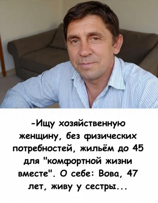 И я решил подойти к вопросу практично. Написал объявление почти как на продажу бытовой техники. Четко, без романтики. В моем возрасте хочется простого: тишина, чистота, чтобы рядом кто-то был, но без драм, без «мне нужно внимание», «мне нужны чувства», «мне нужно, чтобы ты меня хотел». Постель, это для молодых. Мужчина в доме, это уже статус для женщины. Мне важен покой.