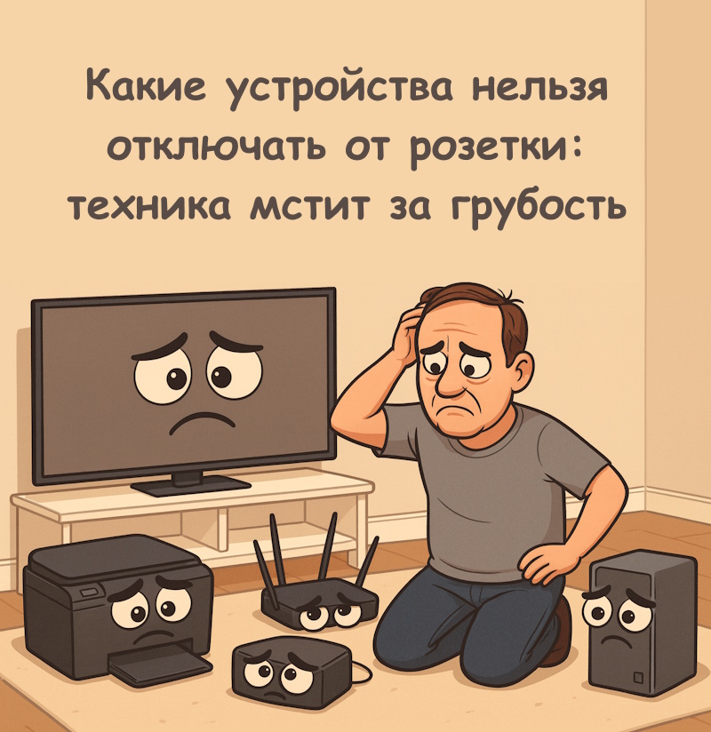 Знакомая картина для тех, кто борется за экономию электричества или параноидально боится пожара от включенной техники. Вот только некоторые устройства воспринимают такое обращение как личное оскорбление. И мстят — поломками, потерей данных, резким сокращением срока службы.