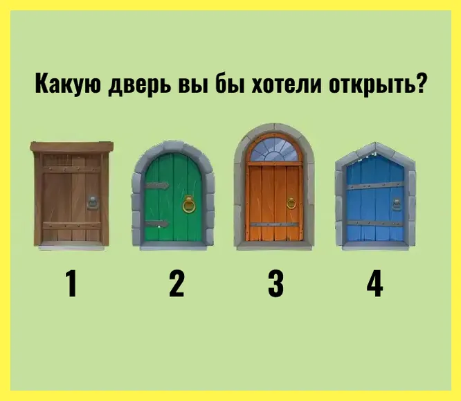 Ваш выбор двери может рассказать о вашем подсознании гораздо больше, чем вы думаете. В психологии выбор входа символизирует то, как мы относимся к новым возможностям и изменениям в жизни. Посмотрите на картинку и выберите ту дверь, которая кажется вам наиболее притягательной.