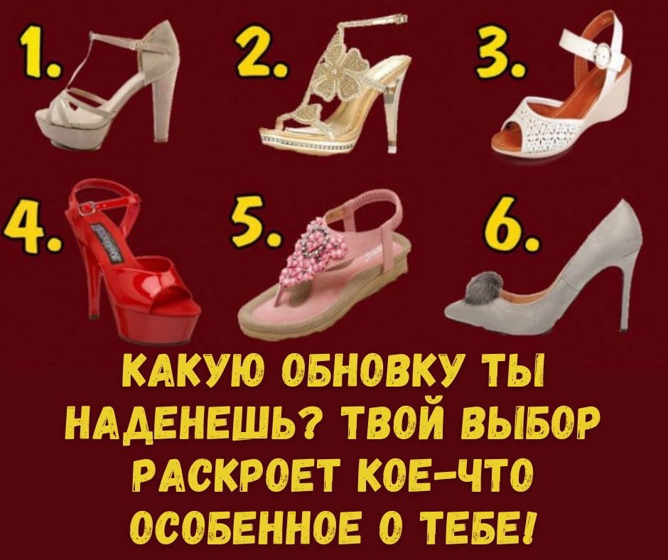 Всё, что вам нужно, это выбрать одни из представленных босоножек и прочитать характеристику о себе и о своём характере. Но не зацикливайтесь на том, какие будут сидеть на вас лучше. Просто выберите то, что вам бросилось в глаза.