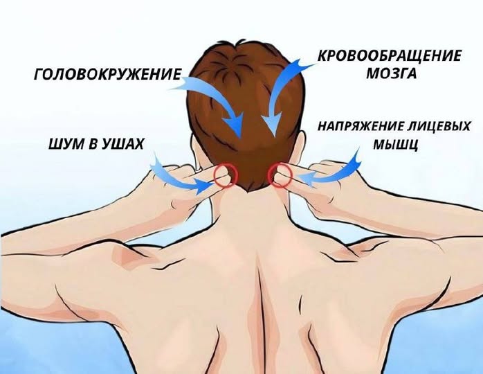 Легкое нажатие. Поставьте палец в ямку под сосцевидным отростком, слегка запрокиньте голову. Надавите до легкого дискомфорта — не до боли! — и дышите глубоко 30–60 секунд. Это расслабляет мышцы и снимает спазм.