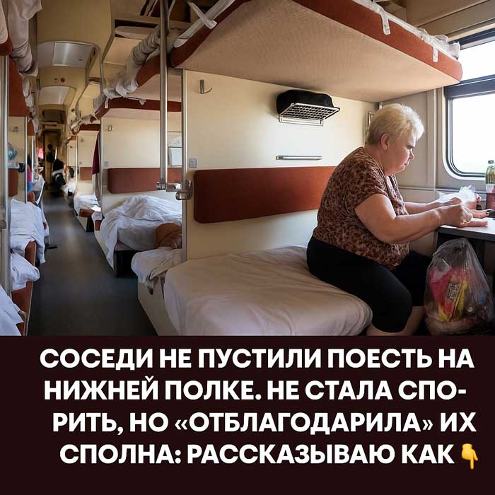 Честно, никогда не понимала людей, которые путешествуют парой, выкупают два нижних места и искренне считают, что весь вагон теперь принадлежит им. Типа «у нас тут вип-зона» 😎. А потом ещё и недовольны, что у верхних пассажиров тоже есть потребности — багаж, еда, туалет, чай… Жизнь, знаете ли, продолжается не только у вас на нижней полке! 😂