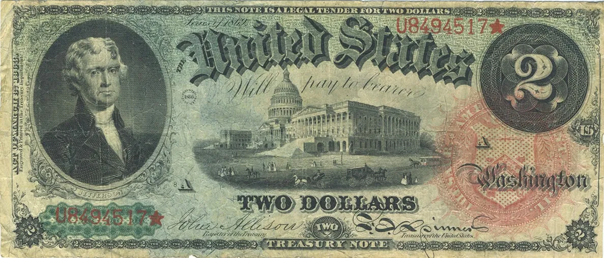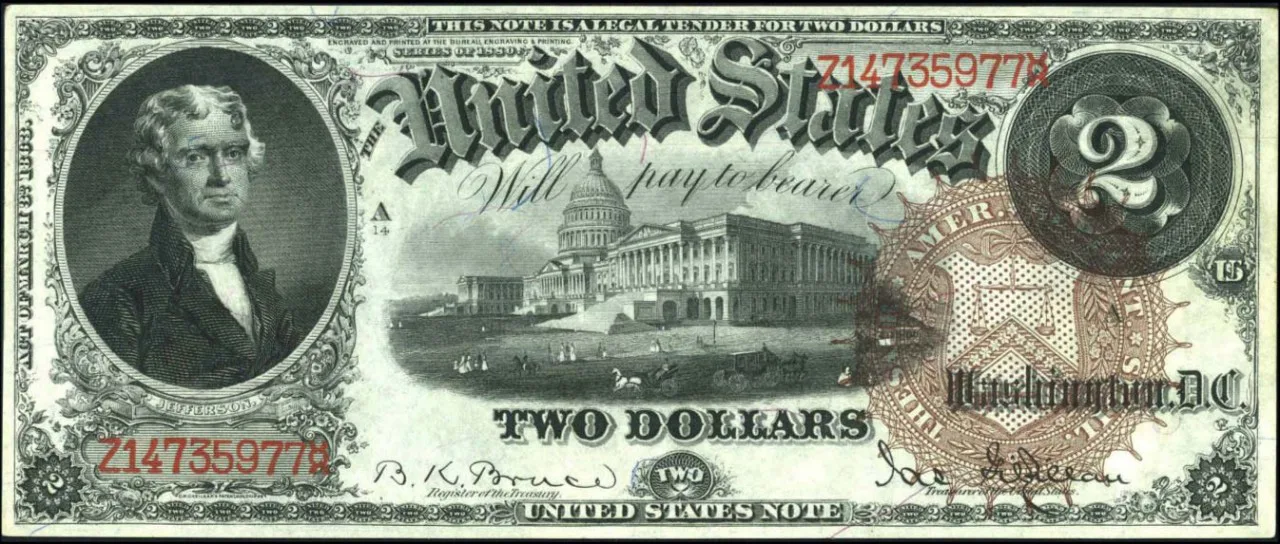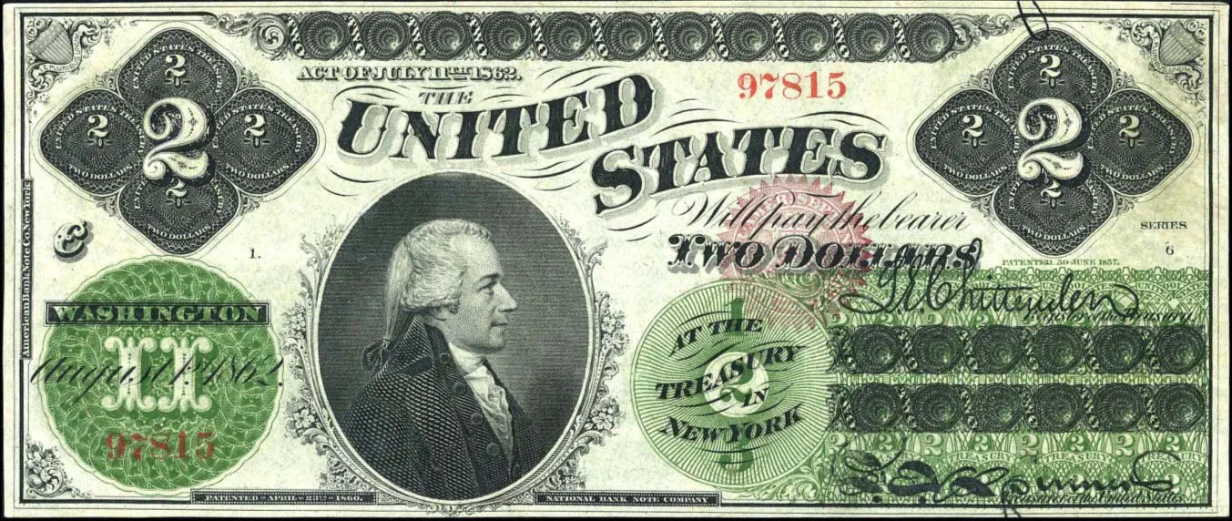 - После начала печати национальных банкнот США, двухдолларовая купюра печатается реже. В период с 1863 по 1882 годы было всего два выпуска купюр этого номинала. Банкноты этого времени в народе получили название «ленивой двойки» из-за того, что изображение «2» напечатано в лежачем положении.