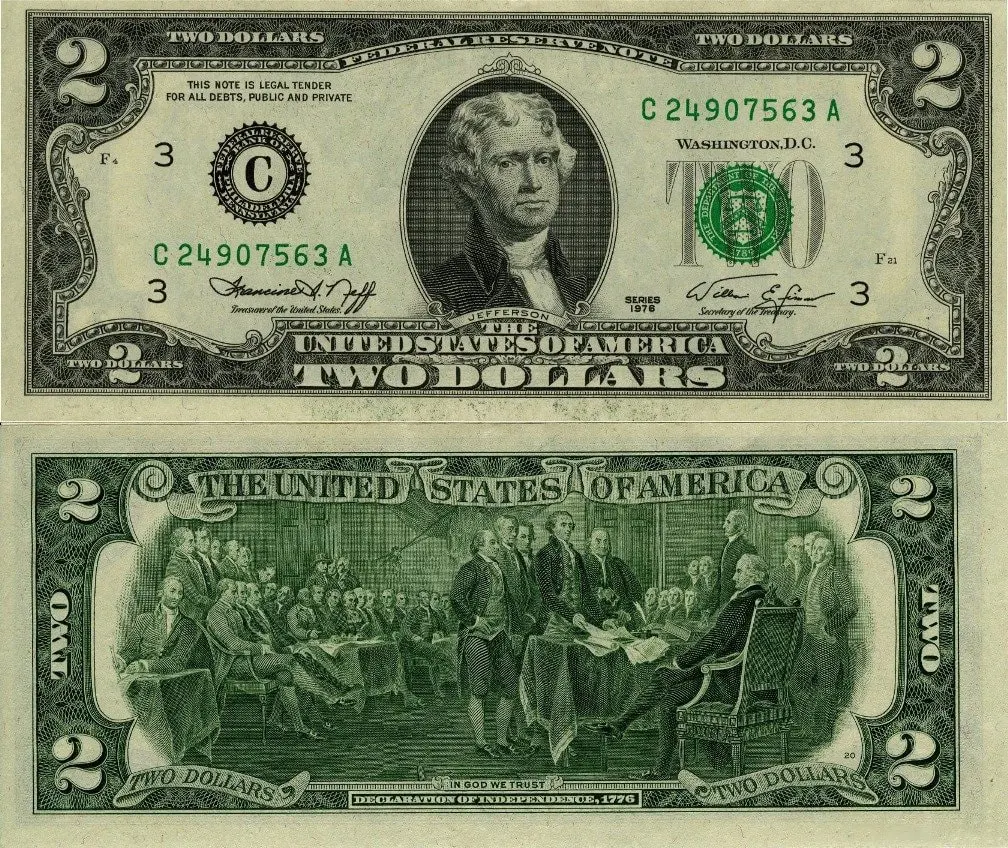 - С 1866 по 1976 годы в выпусках двух долларов был перерыв, а новая партия купюр этого номинала, выпущенная в честь годовщины независимости США, практически полностью стала коллекционной. Многие американцы клеили на банкноту в 2 доллара марки и делали почтовые печати, дарили близким и пополняли свои любительские коллекции.