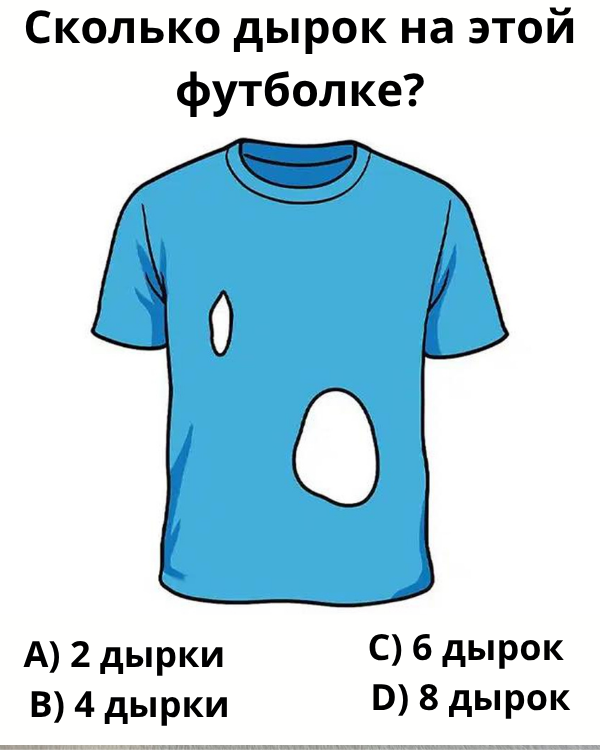 Есть картинки, которые на первый взгляд кажутся совершенно обычными… а потом переворачивают мозг вверх дном! Именно так произошло с этой футболкой, ставшей вирусной в соцсетях: самый обычный предмет одежды, и всё же вопрос с подвохом, который заставляет задуматься. Так что давайте и вам зададим: сколько дыр вы видите на этой футболке? Не так уж просто, правда?