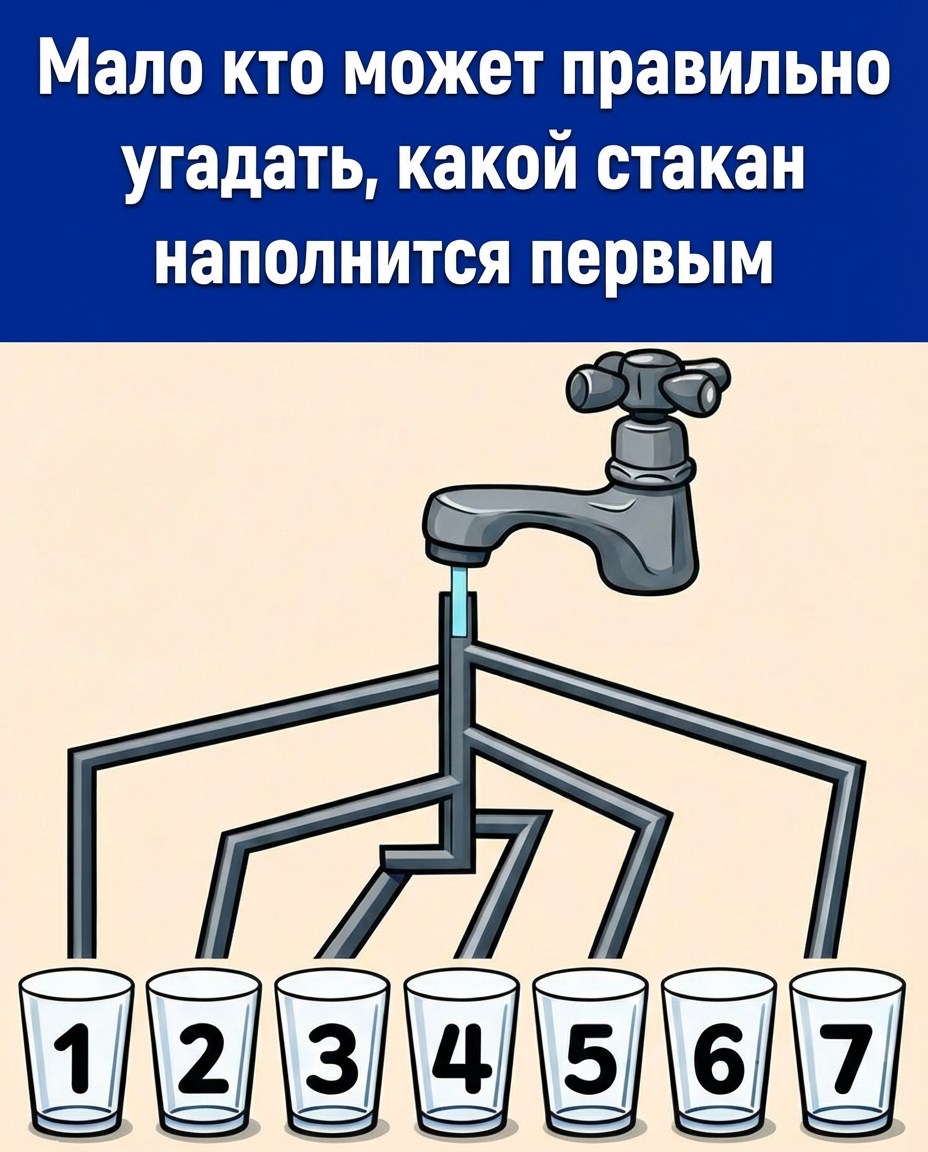 Чаще всего называют стаканы 3, 4 или 7. Они кажутся наиболее подходящими кандидатами на то, чтобы наполниться быстрее остальных. Но в этом и заключается ловушка: эта головоломка проверяет не вашу скорость, а вашу наблюдательность. И это в корне меняет дело.