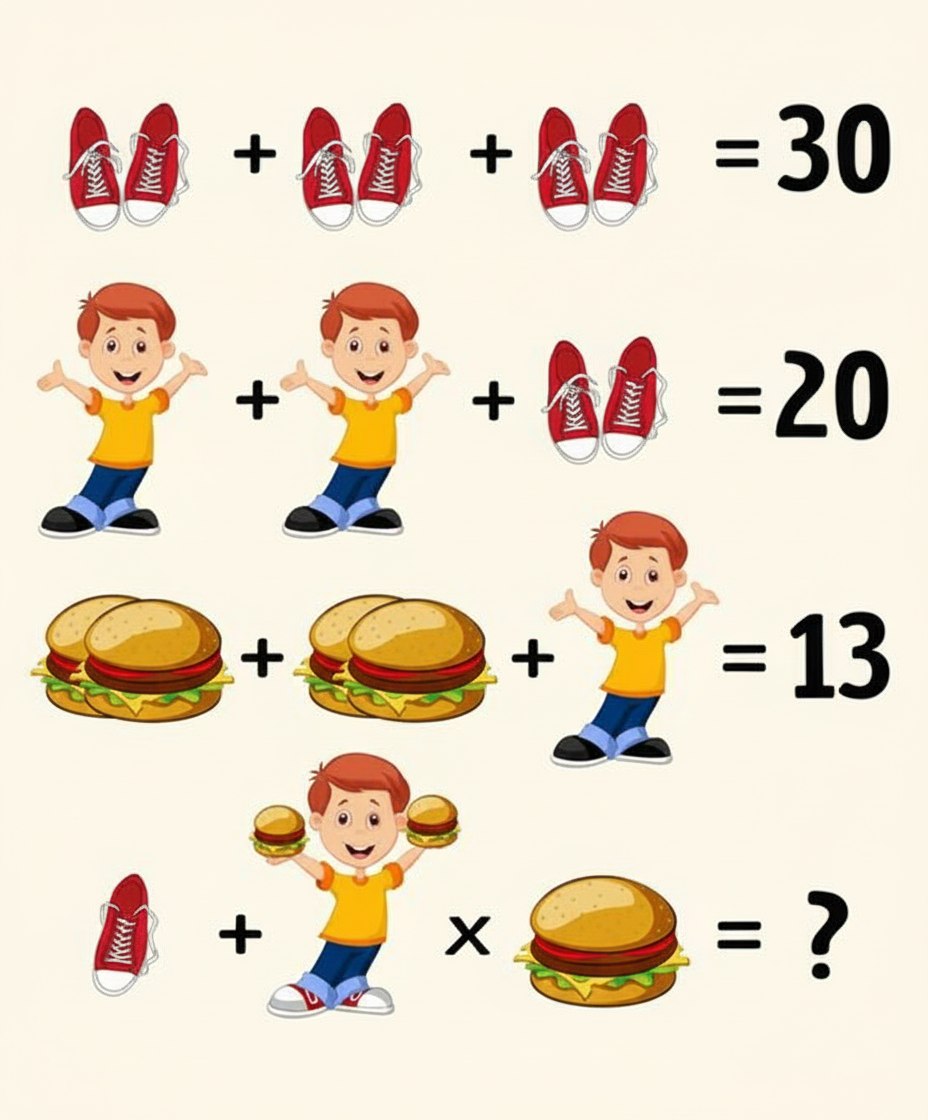 Перед нами четыре уравнения с тремя основными элементами: красными кедами, мальчиком и гамбургерами.