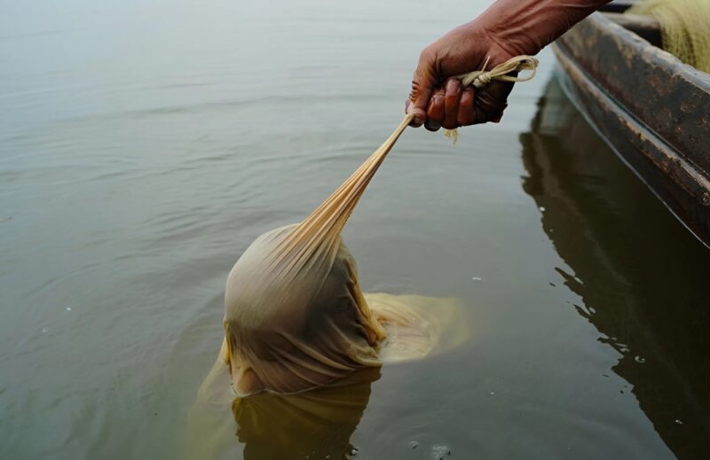 Прошло около получаса. Кто-то уже начал складывать улов в ящик, когда рыбак заметил в воде что-то странное. Оно зацепилось за край сети — обтекаемое, мягкое, обёрнутое в старую ткань. На первый взгляд — вроде мешок с грязью или отбросами. Он потянул за него, и ткань вытянулась, обнажая очертания чего-то округлого, тяжелого. На лодке стало тихо. Остальные встали и смотрели, как он медленно поднимает находку над водой.