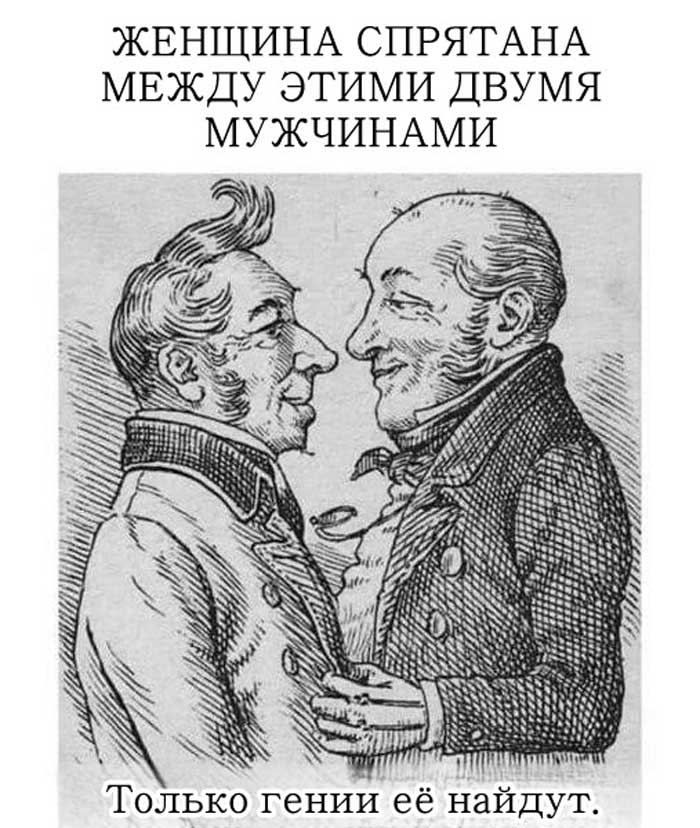 внимательнее, между ними скрыто лицо женщины. > _Подсказка: обратите внимание на пространство между их лицами и воротниками. Вы увидите нечто большее, чем просто складки одежды._