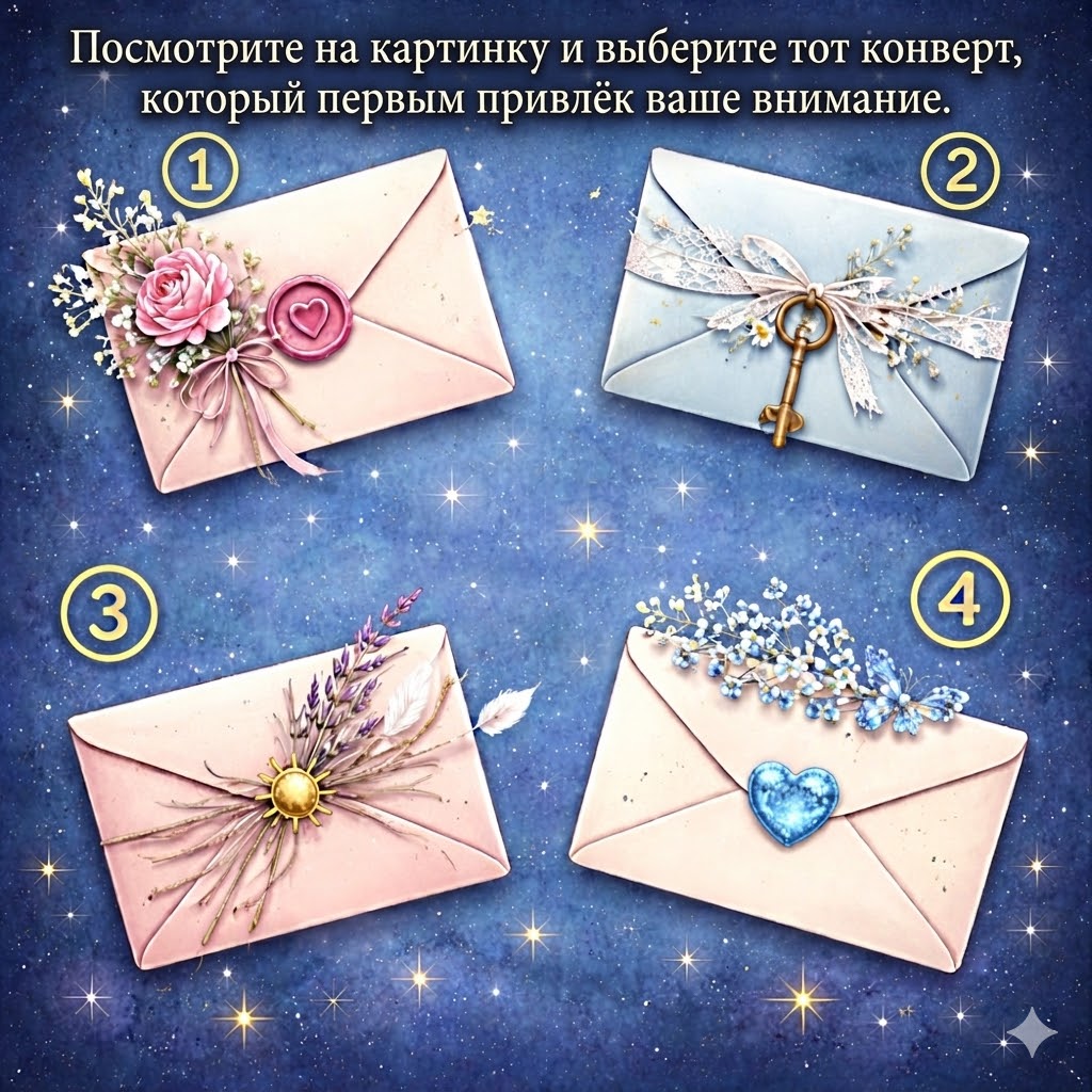 Перед вами четыре красивых конверта. Каждый из них хранит своё послание. Посмотрите на картинку и выберите тот конверт, который первым привлёк ваше внимание.