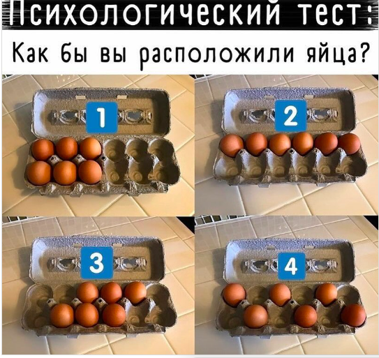 Вот такой получился любопытный тест. Хотя, казалось бы, какая разница, как расположены яйца в картонной коробке. Также проходи другие наши психологические тесты. А еще рассказывай в комментариях, какой вариант ты выбрал в этом тесте. Совпало ли описание с твоими внутренними ощущениями?