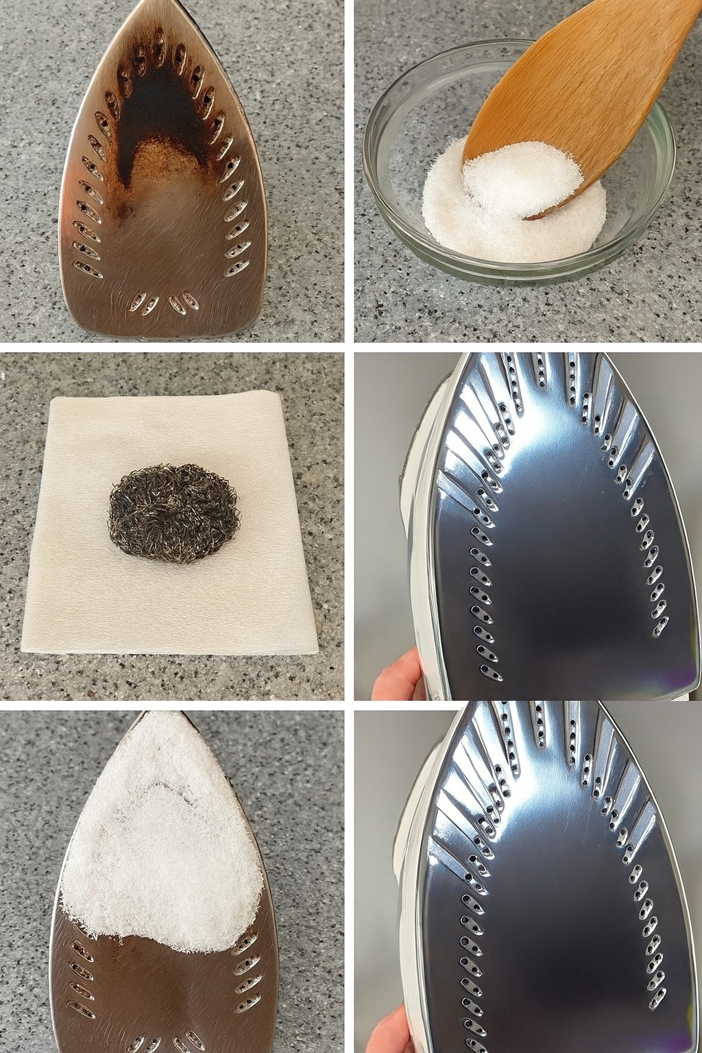 Если подошва утюга сделана из стали, используйте мелкую соль и бумагу для выпечки — это работает безотказно.