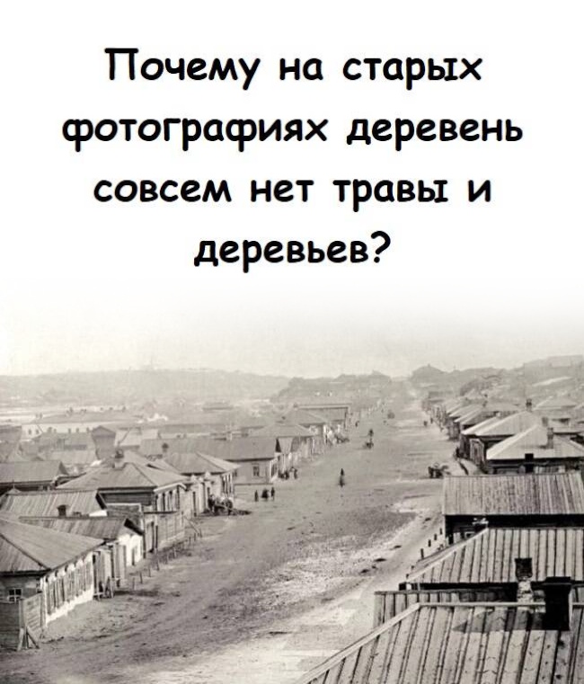 Любуясь старинными снимками из семейного альбома или блуждая по просторам интернета, многие замечают одну странную деталь. Вот она, деревня конца XIX — начала XX века: добротные дома, мощные заборы, колодец…Но чего-то не хватает зелени. Ни тебе буйных зарослей сирени у калитки, ни сочного газона у крыльца, ни раскидистых кленов, дающих тень. Почти лунный пейзаж, если не считать огородов. Куда же подевались все деревья и трава?