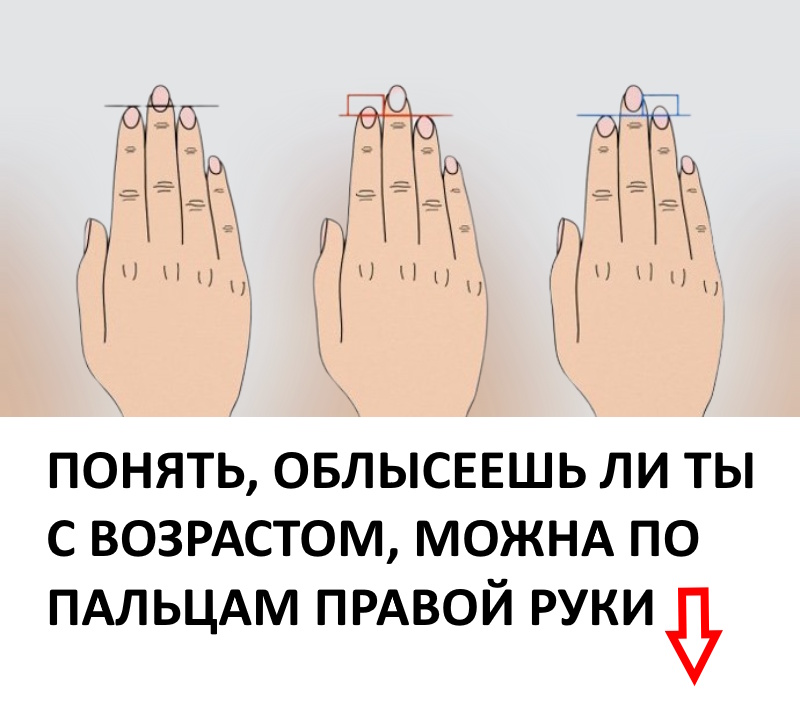 Прямо сейчас вы можете проверить свои шансы облысеть в будущем. Если безымянный палец на правой руке длиннее указательного, то шанс облысеть у вас в 6 раз выше, чем у мужчины, у которого длина безымянного пальца равна длине указательного или меньше.