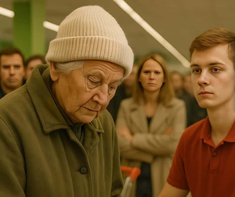 Передо мной в очереди к кассе стояла пожилая женщина, лет семидесяти. На ней была старая выцветшая куртка и вязаная шапка, натянутая почти до бровей. В руках она держала хлеб, небольшой кусок сыра и баночку сметаны. Пальцы у неё дрожали — то ли от холода, то ли от волнения.