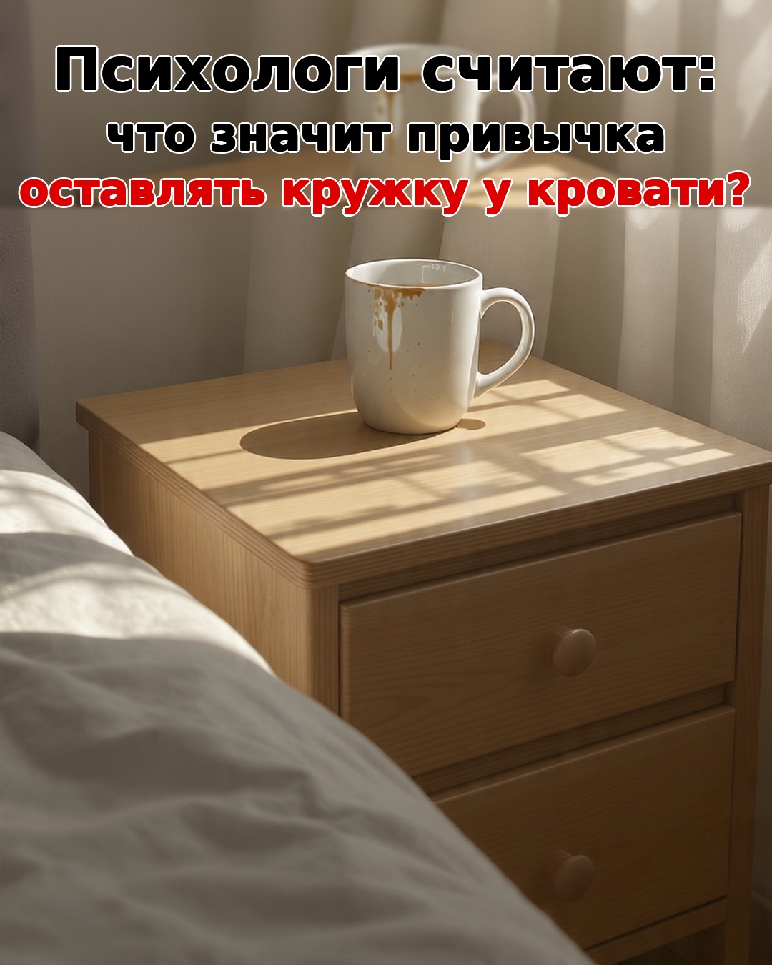 Это не про лень, а про границы дня. Кровать — место перехода от «надо» к «можно». Оставить кружку — бессознательный способ продлить вечер, не завершать день официально. Исследования по «прокрастинации сна» показывают: маленькие ритуалы у кровати успокаивают нервную систему.