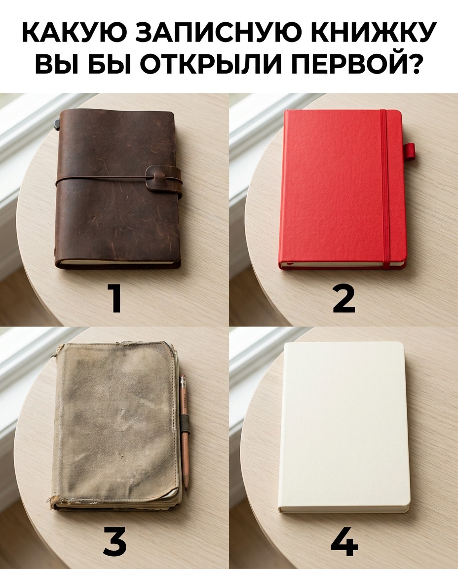 Посмотрите на 4 записные книжки и выберите ту, которую вам захотелось бы открыть первой. Не анализируйте слишком долго — обычно именно первый выбор оказывается самым честным.