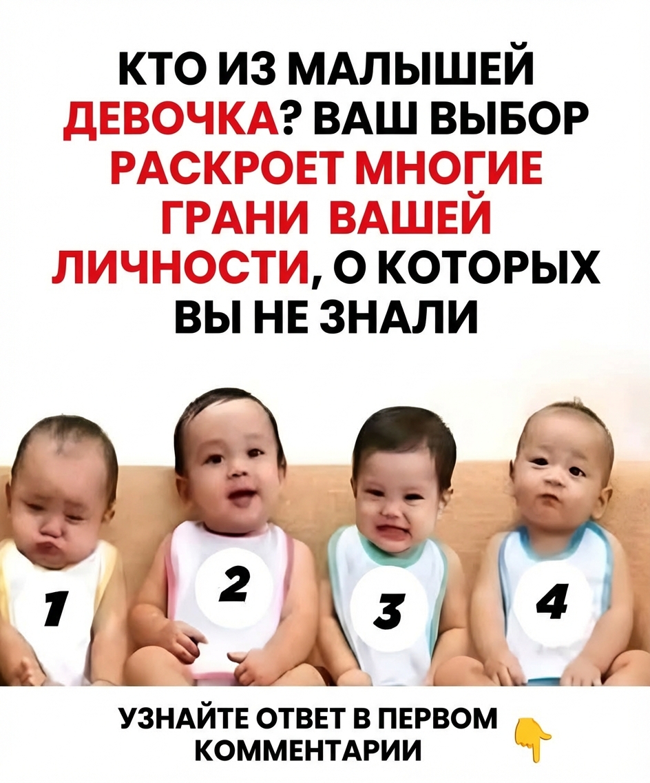 Представьте: перед вами очаровательная картинка, на которой четыре младенца. Они пронумерованы от 1 до 4. Вопрос прост до невозможности: «Кто из них девочка?» Вы моментально делаете свой выбор, повинуясь лишь инстинкту, не правда ли? А что, если этот импульсивный ответ способен раскрыть о вас больше, чем вы думаете? Конечно, это не научное исследование, но прекрасный шанс взглянуть на себя с новой стороны и, возможно, улыбнуться!