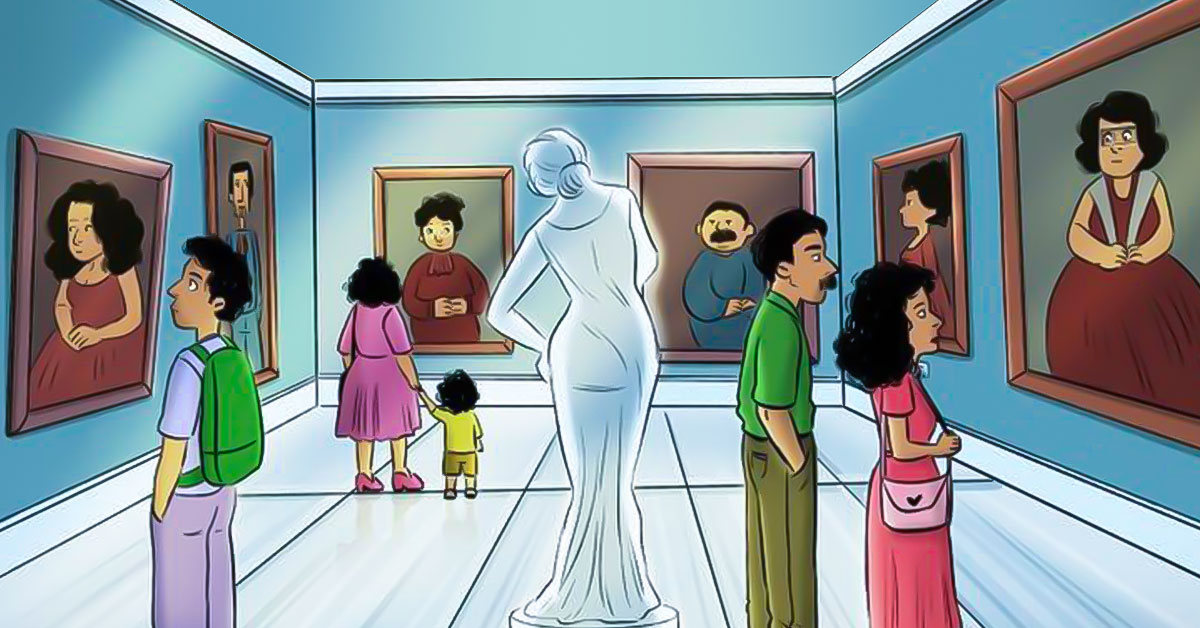 Но что же наша головоломка? Видишь ли, на самом деле на картинке находится не пять, а шесть людей. Предлагаем тебе внимательнее взглянуть на даму, что изображена напротив супружеской пары справа. Как нетрудно заметить, глаза у нее явно не нарисованы. Дело в том, что за ней кто-то спрятался и украдкой наблюдает за посетителями.
