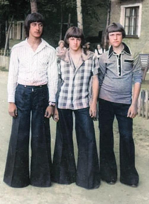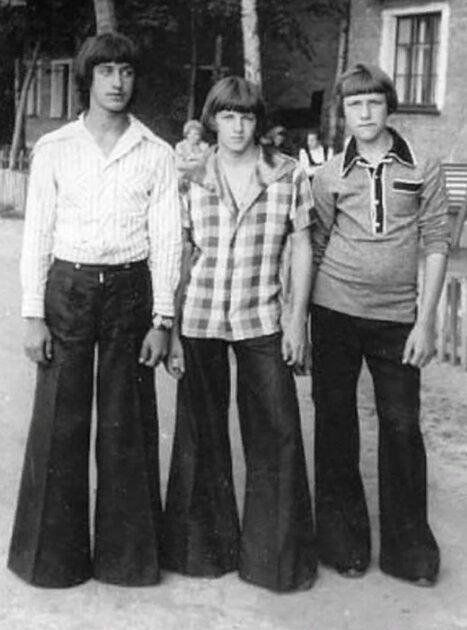 Брюки-клеш также занимали твердую позицию у модников тех времен. При чем можно было их заметить как на женщинах, так и на мужчинах.