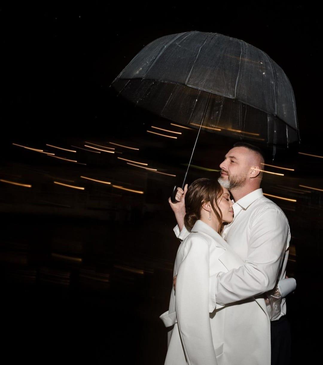 Сегодня счастливая невеста поделилась в блоге трогательными кадрами. На фото Анна и Антон мило обнимаются, стоя под зонтиком, и счастливо улыбаются, глядя друг на друга. Жених для церемонии бракосочетания выбрал классический наряд: белая рубашка и черные брюки. А невеста решила отказаться от пышного платья и позирует на кадрах в скромном пальто.