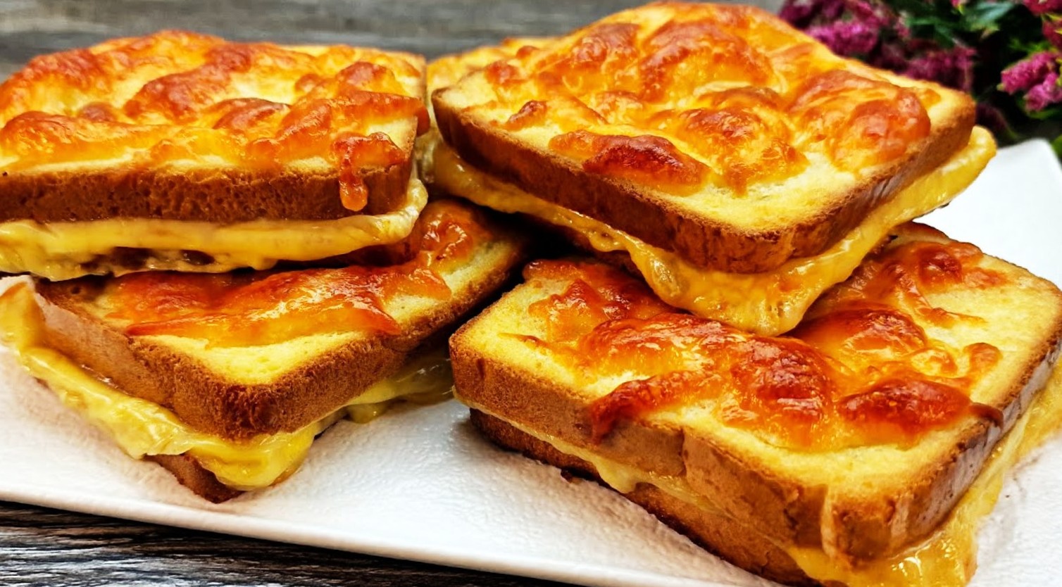 На верхушку сэндвичей выкладываем по кусочку сливочного масла, а также создаем сырные шапки из твердого сыра. Выпекаем сэндвичи при 190-200 градусах примерно 15-20 минут.