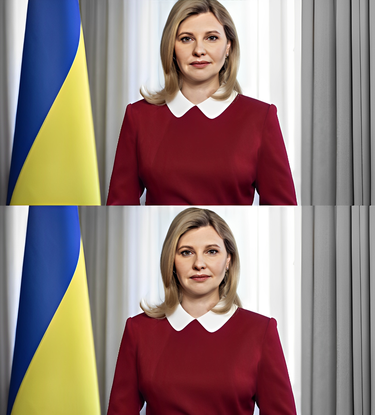 Під час відеозвернення Олена з’явилася в ефектному образі, у якому ми її ще не бачили. На першій леді була закрита сукня вишневого відтінку з довгими рукавами, тканинним поясом в тон, білим округлим коміром і білими манжетами. Свій образ Зеленська доповнила акуратним укладанням із боковим проділом, ніжним макіяжем і сережками-пусетами.