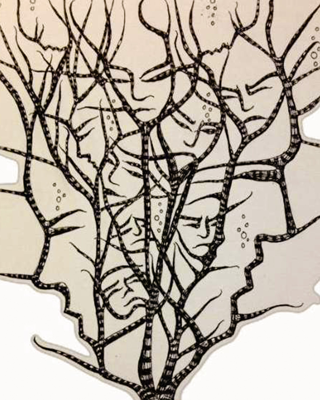 Каждое лицо искусно вплетено в формы изображения. Они сливаются с линиями, обвиваются вокруг узоров, маскируются в контрастах… До такой степени, что можно поверить, будто их и вовсе нет. И тем не менее, они действительно здесь, скрытые от посторонних глаз.