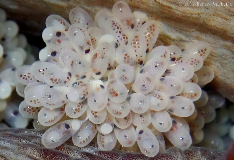 Именно там Мера, осьминог с проницательными глазами, отложила множество перламутровых яиц.