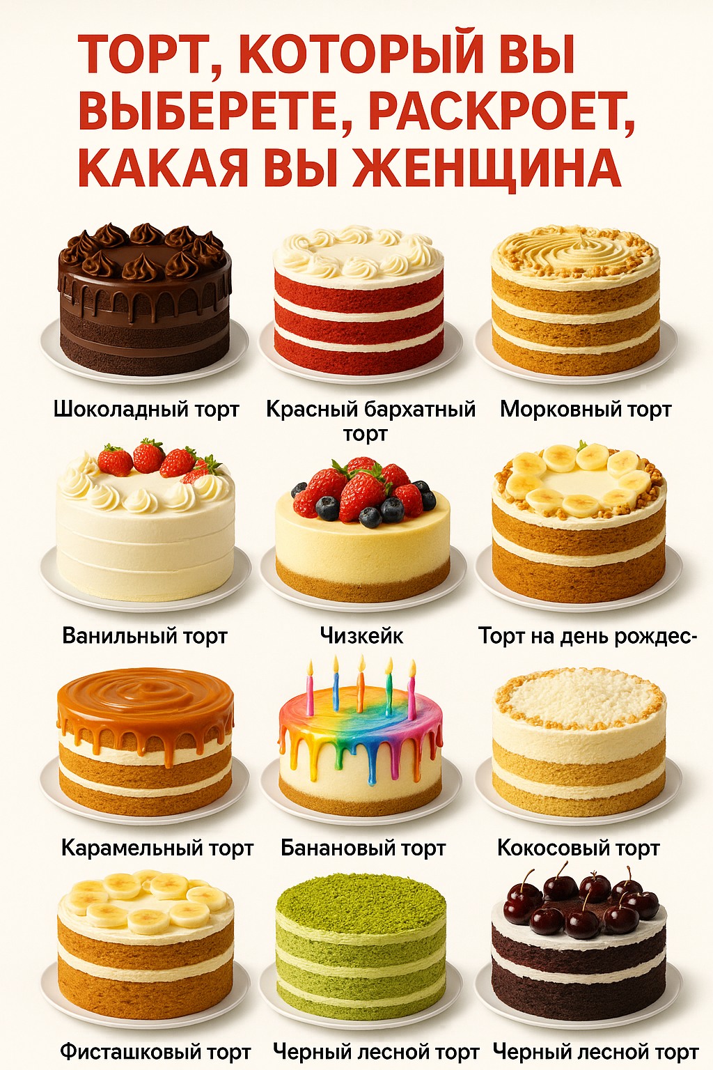 Десерт — это не просто сладость. Он отражает настроение, привычки и даже скрытые стороны личности. Посмотри, что именно говорит о тебе твой выбор торта!