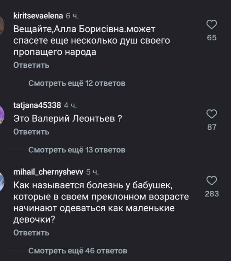 “Люди, куда вы катитесь? Что она вам плохого сделал?”, “Аллочка, вы- легенда. Я вас обожаю”, “Хочу пожелать вам крепкого здоровья и сил, чтобы выдержать это”, “Алла Борисовна, вы- легенда”,