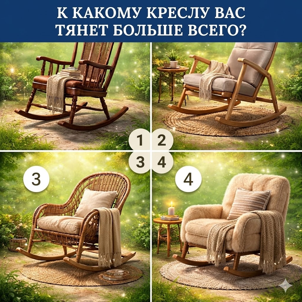 Посмотрите на картинку с четырьмя креслами-качалками. Просто почувствуйте, к какому креслу вас тянет больше всего. Представьте, что вы можете сесть только в одно из них. Какое выберете — 1, 2, 3 или 4? А теперь прочитайте расшифровку.