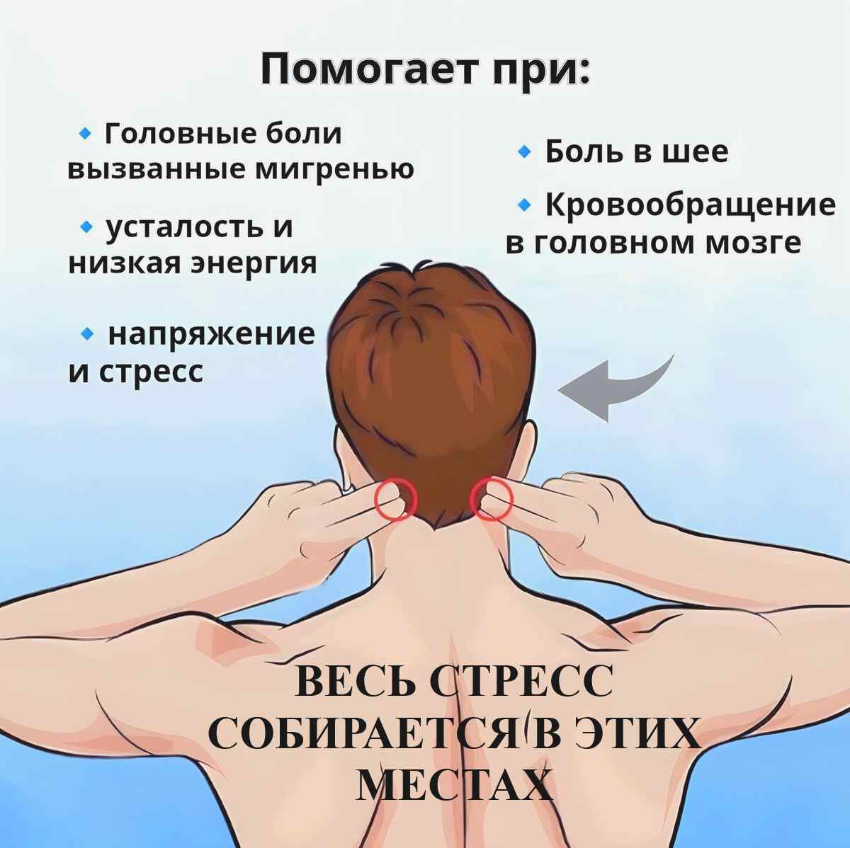 На задней поверхности шеи, в месте, где начинается рост волос, есть два углубления. Именно их стоит прорабатывать, но нужно быть осторожным. Особенно аккуратным следует быть при наличии грыжи, остеохондрозе и проблемах с сосудами. Простой способ массажа: наклоните голову назад и надавите слегка на эти точки. Таким образом, вы можете снять напряжение, усталость и даже избавиться от мигрени.