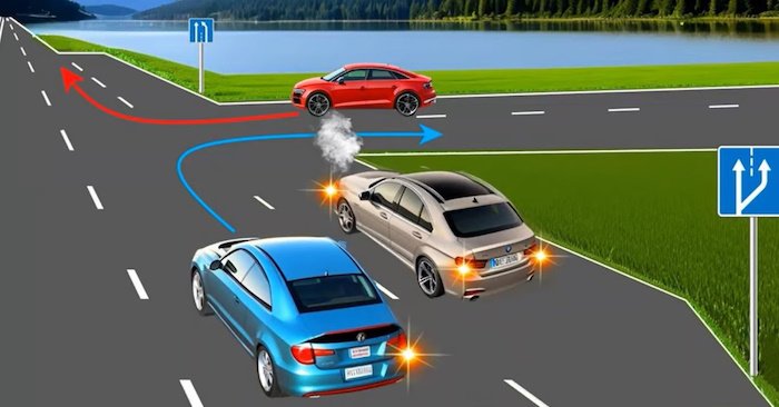 Другими словами, водитель красного авто точно нарушает, ведь собирается выехать на дорогу, игнорируя полосу разгона. А что же делать с синим авто? Оно должно было сместиться на полосу торможения, но не имело такой возможности из-за серого автомобиля, водитель которого включил аварийные огни.