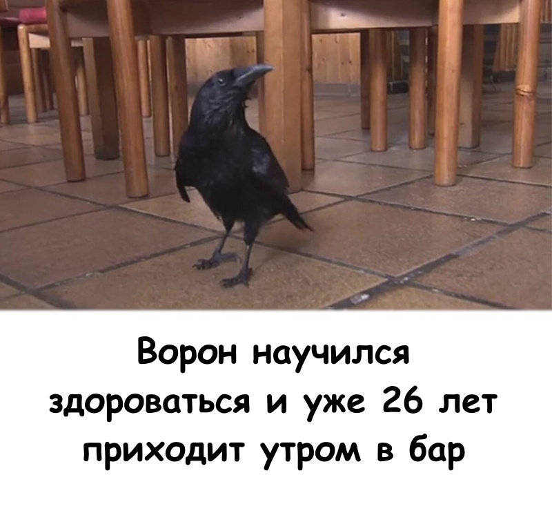 Уже 26 лет владельцы бара в Посада-де-Льянес (Испания) начинают утро с прихода необычного посетителя. Первым в двери заведения традиционно заходит ворон, который мило всем говорит Hola — «Привет!». Он знает хозяев в лицо и еще не пропустил ни одного дня в баре.