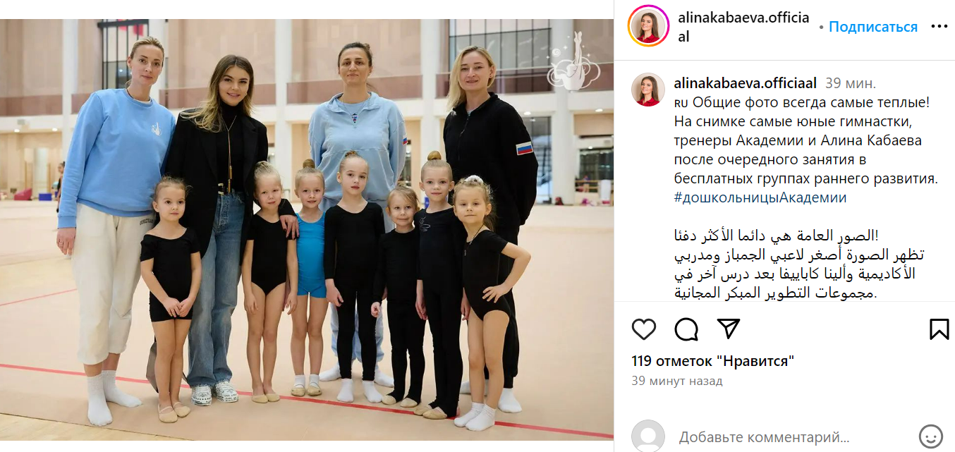 На снимке самые юные гимнастки, тренеры Академии и Алина Кабаева после очередного занятия в бесплатных группах раннего развития», — гласит подпись под свежей публикацией в микроблоге звезды.