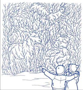 На этой картинке изображены двое ребят, а также трое животных. Только человек с хорошо развитым воображением и пространственным мышлением сможет здесь отыскать за 20 секунд белку, лося и медведя.