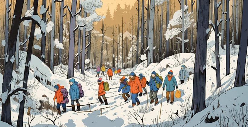 Устав от безделья на новогодних каникулах, сопровождающегося поеданием оливье и селедки под шубой, эти энтузиасты разбрелись по лесу. Кто-то любуется сверкающим в солнечных лучах снежком на ветках, а также разглядывает под кустами следы диких животных, а кто-то подыскивает подходящее место для привала и мангала.